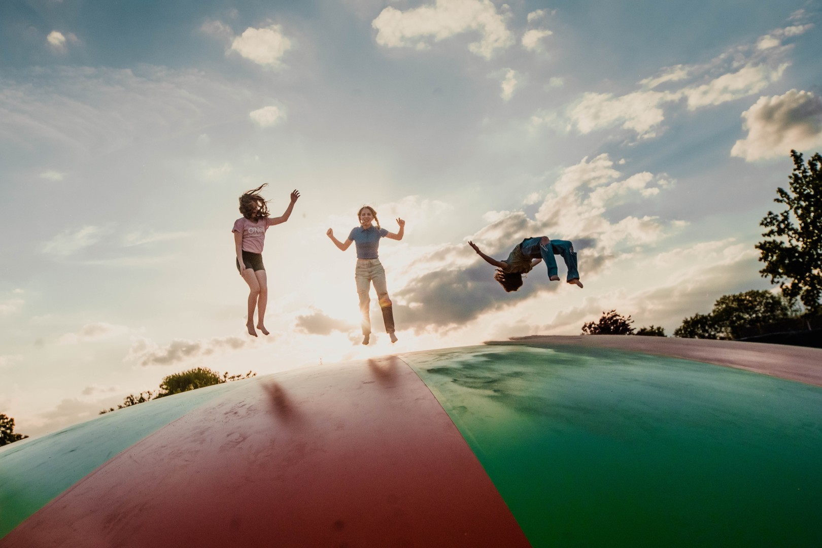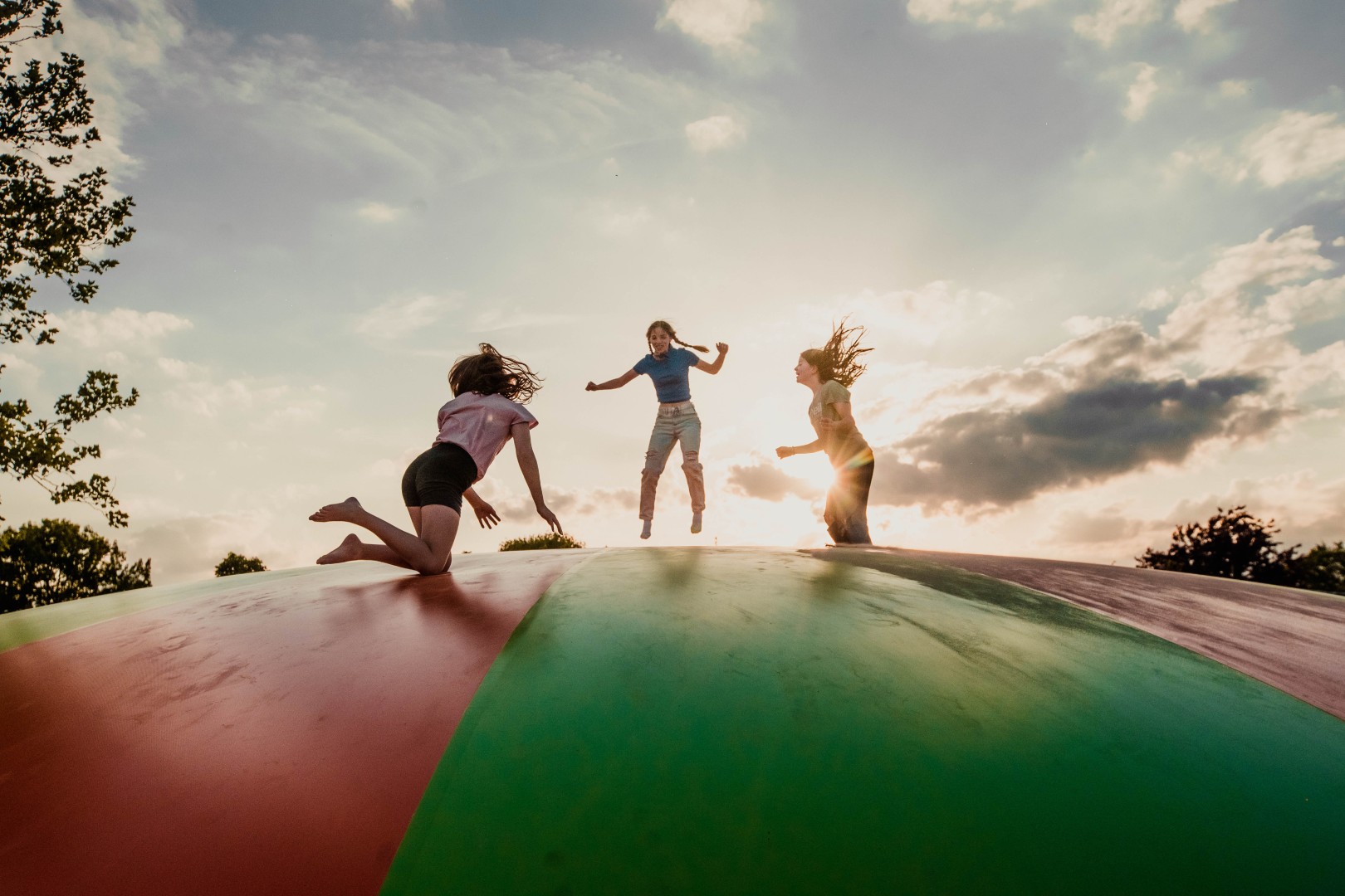 Ren, spring en vlieg... Op onze springkussens met verschillende hoogtes kan iedereen zich uitleven. Wat is er leuker dan zo hoog mogelijk te springen met de wind in de haren en de zon op je gezicht? Beverland heeft 2 reuze springkussens in de buitenspeeltuin.